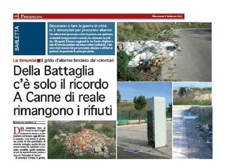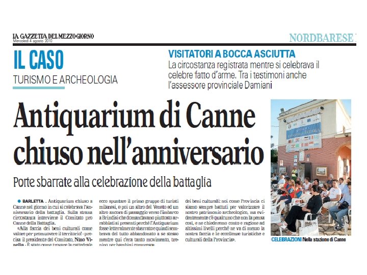 • 2010 2011 IL DIARIO DI UN ANNO SCANDALOSO 04/08/2010. CANNE DELLA BATTAGLIA - ANTIQUARIUM CHIUSO AL PUBBLICO IL 2 AGOSTO POMERIGGIO NELL'ANNIVERSARIO DELLA CELEBRE BATTAGLIA. 30/09/2010. CANNE DELLA BATTAGLIA - CHIUSURA BOOKSHOP: IL SINDACO MAFFEI CHIEDE INCONTRO CON LA SOPRINTENDENZA ARCHEOLOGICA. 10/10/2010. SOS CANNE DELLA BATTAGLIA - DOMENICA 10 / 10 ANTIQUARIUM E BOOKSHOP: CONCRETE RISPOSTE DELLE ISTITUZIONI ALLA GIORNATA DI “SOLIDARIETA’ ALLA CULTURA ED A CHI CI LAVORA”. SI APRE UNA SETTIMANA DECISIVA PER REGIONE, PROVINCIA, COMUNE. 14/11/2010. SOS CANNE DELLA BATTAGLIA - CROLLA LA CITTADELLA COME A POMPEI: DOV'ERA IL CENTRO-SINISTRA DI BARLETTA IN QUESTI ULTIMI DIECI ANNI? 25/11/2010. DA POMPEI A CANNE DELLA BATTAGLIA CROLLA L’ARCHEOLOGIA: ECCO COSA PUO’ ACCADERE ANCHE QUANDO CI SONO I SOLDI MA SPESI MALE! COSI’ E’ DIVENTATO UN ALTRO MONUMENTO ALL’ABBANDONO ED ALLO SPRECO IL MURAGLIONE CROLLATO SULLA CITTADELLA A MAGGIO 2003.