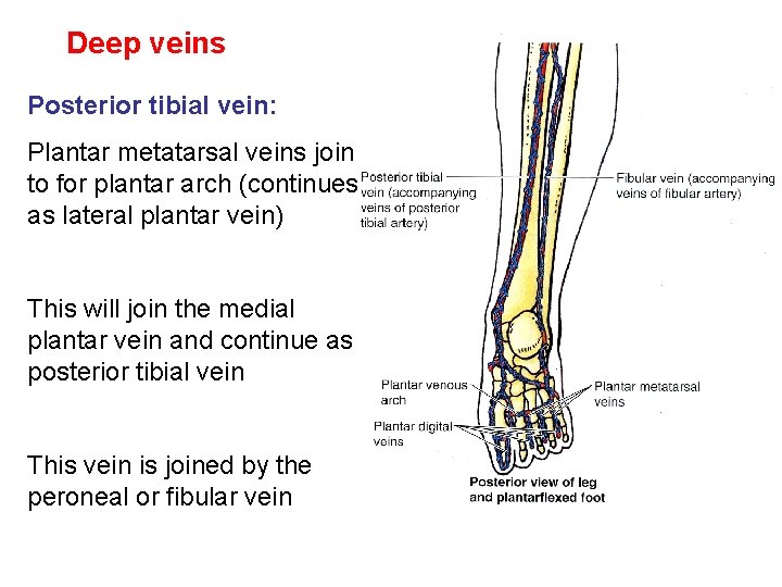 Deep veins Posterior tibial vein: Plantar metatarsal veins join to for plantar arch (continues as lateral plantar vein) This will join the medial plantar vein and continue as posterior tibial vein This vein is joined by the peroneal or fibular vein