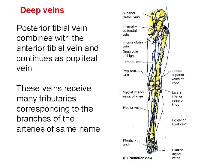 Deep veins Posterior tibial vein combines with the anterior tibial vein and continues as popliteal vein These veins receive many tributaries corresponding to the branches of the arteries of same name