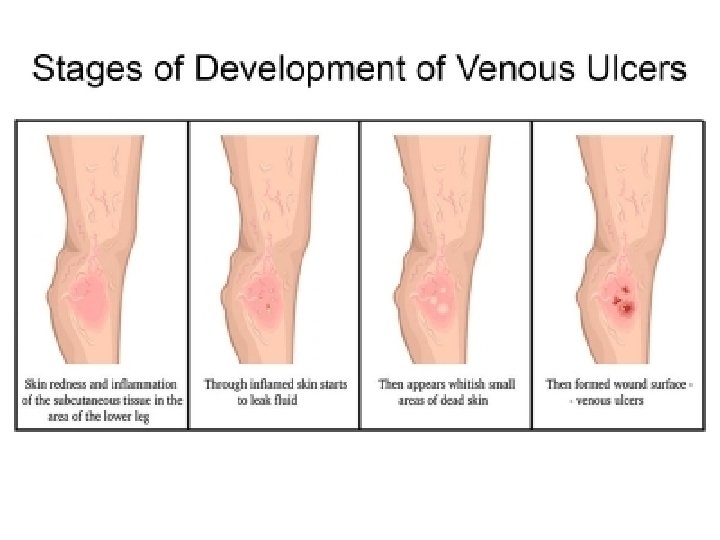 Venous ulcers • Found on the lower extremity at the pretibial and the medial supra-malleolar areas of the ankle • known as “venous stasis” ulcers because their development was thought to be caused by blood pooled in the veins.