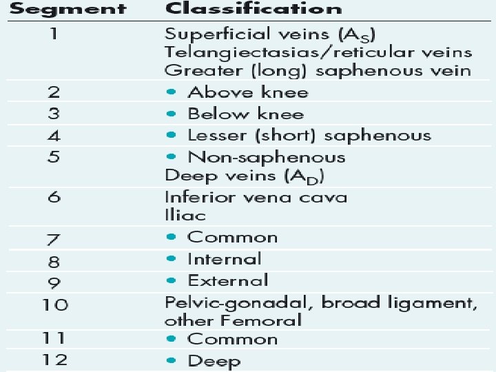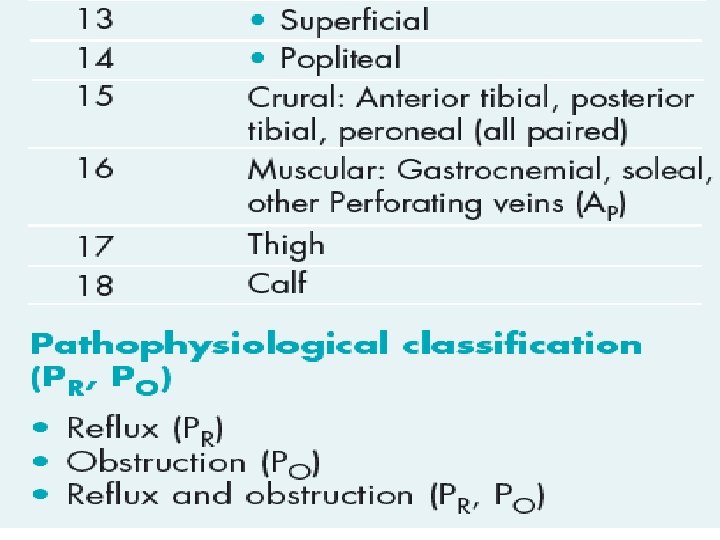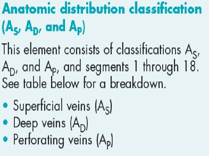 CEAP classification system • The CEAP classification system for chronic • venous disease consists of four elements: • Clinical classification • Etiologic classification • Anatomic classification • Pathophysiological classification.
