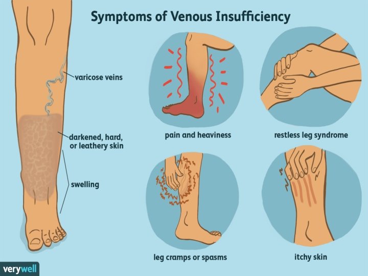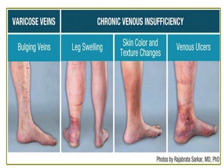 • venous stasis, hyper pigmentation of the subcutaneous tissues. • the characteristics of long-standing venous insufficiency called lipodermatosclerosis • Many patients with venous insufficiency—even those in whom the condition is mild—report nocturnal leg cramps. • fluid distention of the muscular cells, causing tetanic-like contractions of various muscle groups. • The appearance of telangiectasias, more commonly called “spider veins, ” is the result of distention of the smaller subdermal capillary network. • Venous aneurysms due to massive dilation of the greater saphenous vein and its tributaries.