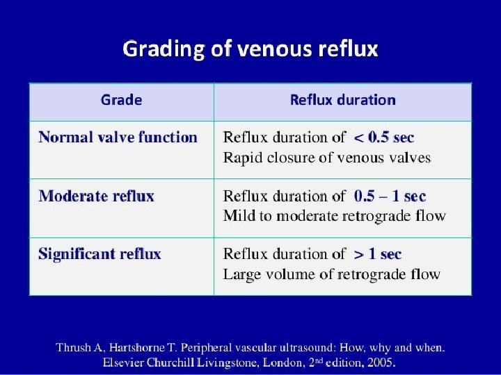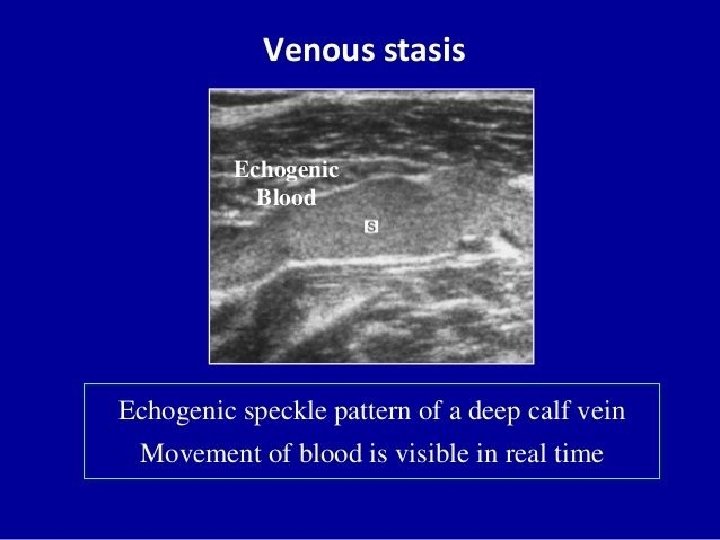 Duplex ultrasound • The advantage of venous duplex imaging is that it can identify sites of thrombosis with high levels of accuracy. • The disadvantage is that it’s fairly time consuming, taking 1 to 2 hours per evaluation for a full leg imaging.