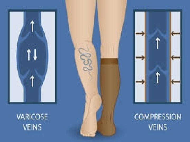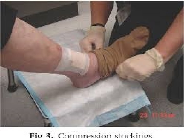 Compression • Compression is the application of pressure to the limb. It is measured in millimeters of mercury (mm Hg) and is applied by bandages, elastic stockings, and/or intermittent pneumatic compression pumps. • Elastic bandages are considered long stretch and capable of stretching to double their size. Because these dressings can be stretched too tight, they are not recommended as a primary dressing for compression. • Inelastic bandages are nonstretch bandages, short-stretch bandages, and zinc paste bandages. The resting pressure under inelastic bandages decreases over a 24 -hour period, but the working pressure (with muscle movement) decreases less. • Compression wraps should be applied starting just below the toes and ending just below (two finger breadths) the popliteal fossa.