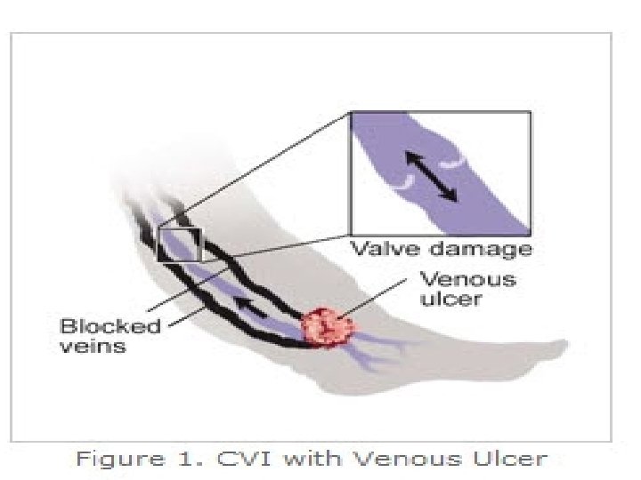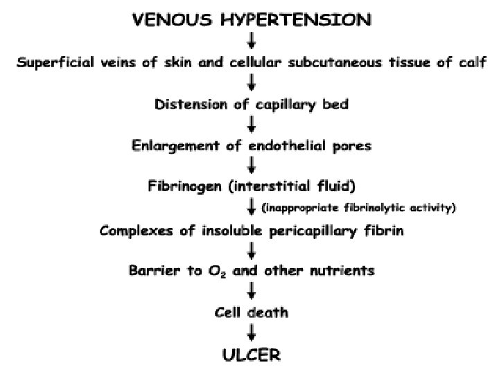 • stagnation of flow thrombophlebitis Thrombosis adheres to the wall of the vein valves remain incompetent to compensate for the reduced venous return, the surrounding collateral veins dilate Increased venous pressure impedes capillary flow, decreasing oxygen available Tissue damage, scar formation and, ultimately, ulceration. • In varicose veins, the endothelial-enhanced noradrenaline vasoconstriction is decreased. • Endothelial damage is thought to be a possible cause of venous dilatation and subsequent varicose veins. • Venous leg ulcers are also correlated with increased ambulatory venous pressures. • With loss of perforator valve function, the high intracompartmental venous pressure, which can approach 200 mm Hg during active muscle contraction, results in distention of the saphenous system.