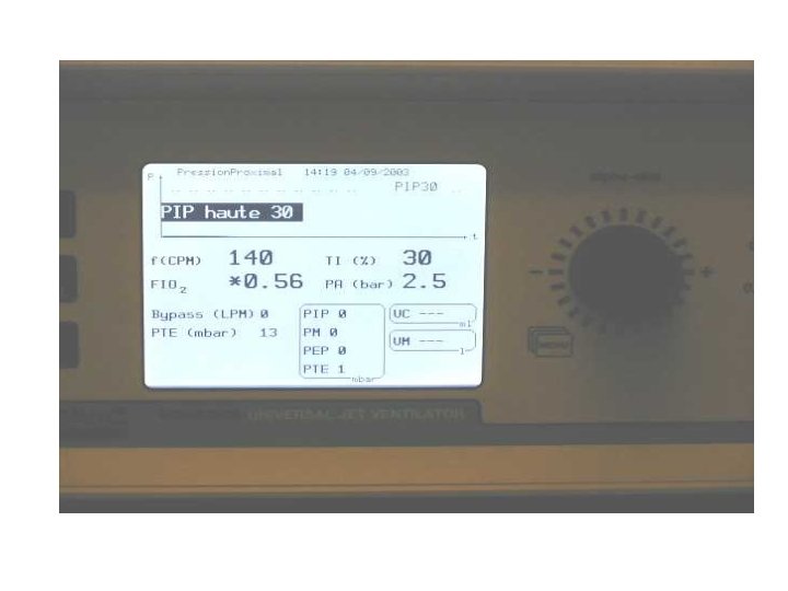 MODE PARTICULIER • Ventilation à haute fréquence ou JET ventilation: ventilation qui se fait à travers un cathéter inter crico-thyroidien le plus souvent si non en translaryngé au tour de 100 - 200 cycles /min , avec de petits volumes injectés sous régime de pression.