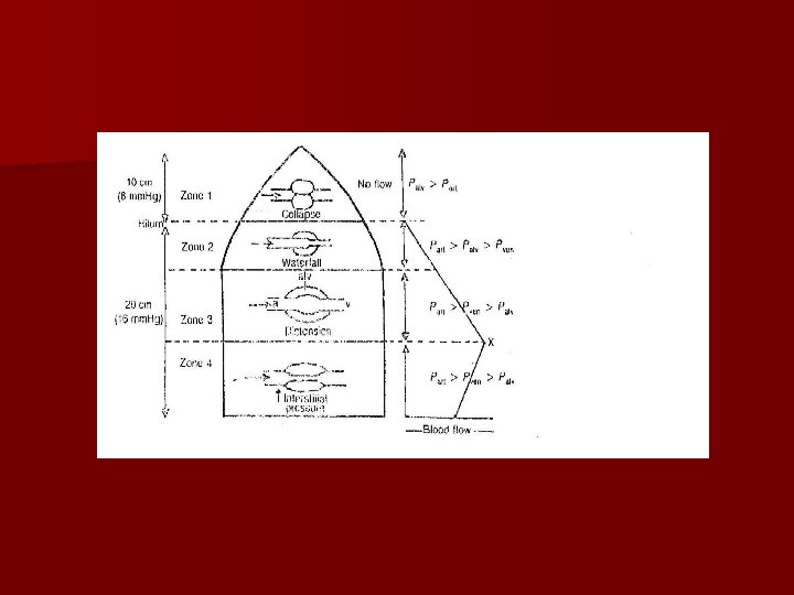 Perfusion zones of the vertical lung n 1 -Zone I: Palv > Part > Pven (no flow, collapse) n 2 -Zone 2: Part > Palv > Pven. (water fall) n 3 -Zone 3: Part > P ven > Palv. (distension) n 4 -Zone 4: Part > P ven > Palv (interstitial pressure)