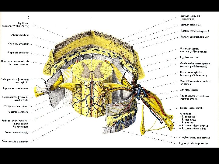 Meninges of the spinal cord Epidural space (Spatium epidurale) Dura mater spinalis Lig. dent. Pia mater Arachnoidea Sp sub-d Dura mater Subdural space (Spatium subdurale) Arachnoidea spinalis Subarachnoid space (Cavitas subarachnoidea) Pia mater spinalis: lig. denticulatum