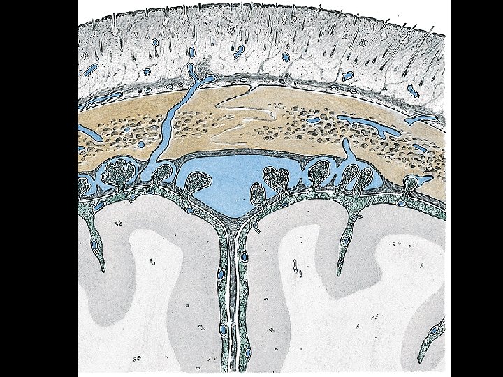 Arachnoid mater ■ Thin avascular delicate layer ■ It passes over sulci of the brain ■ Pinhead pouches project through the dural wall of the major venous sinuses Granulationes arachnoideales - transfer of CSF to the venous system