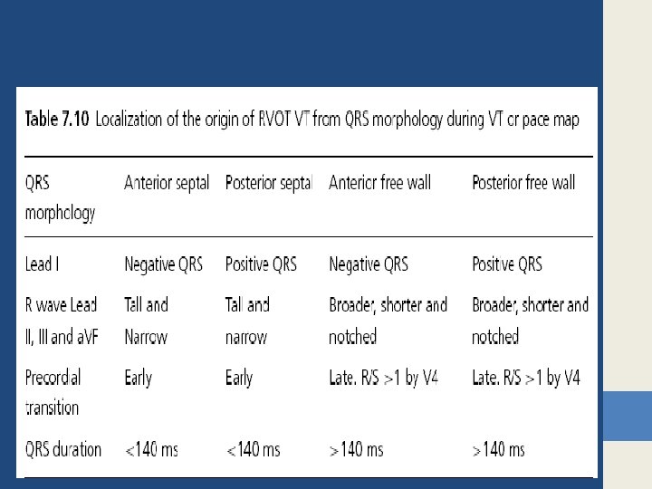 Anterior vs posterior QRS morphology in lead I is helpful in differentiating anterior vs posterior location in RVOT. Negative QRS for tachycardia originating from anterior aspect of RVOT Positive QRS for tacycardia originating from posterior aspect of RVOT Site 2, typically displays either a biphasic or a multiphasic QRS pattern in lead I