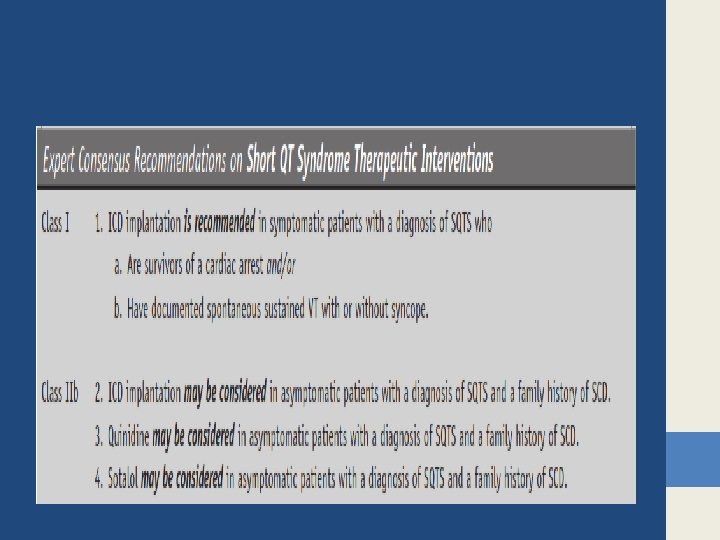 Management Avoid trigger events and medications prolong QT interval Risk stratification schemes based on degree of QT prolongation, genotype, and sex Corrected QT interval exceeding 500 ms poses a high risk for cardiac events - Patients who have LQT 2 and LQT 3 may be at higher risk for SCD compared with patients who have LQT 1