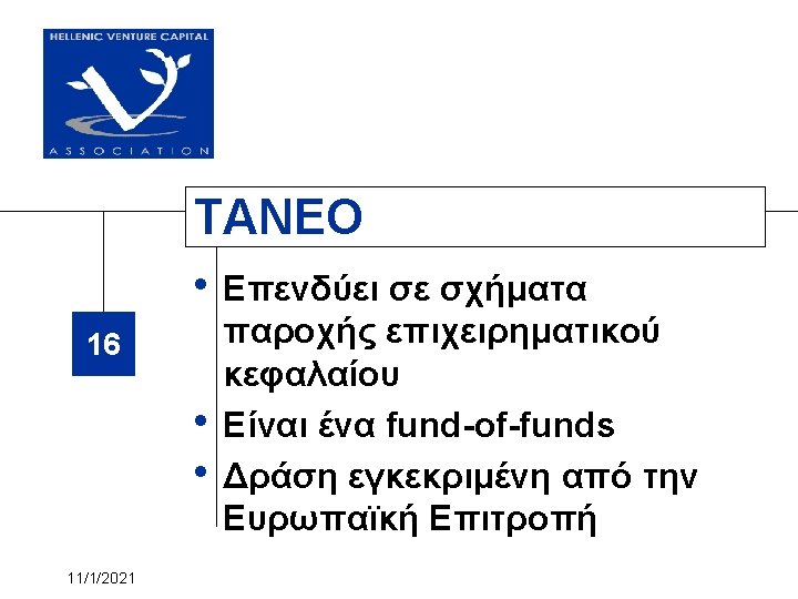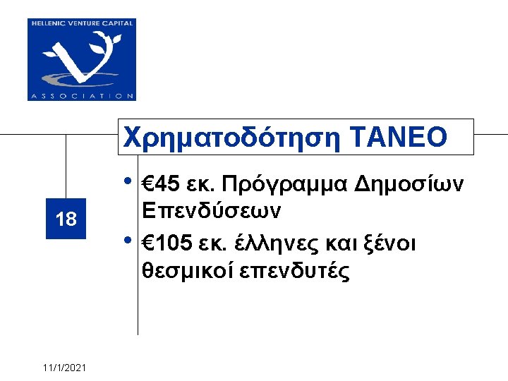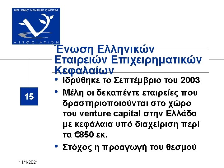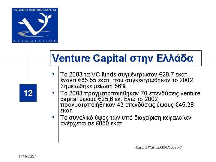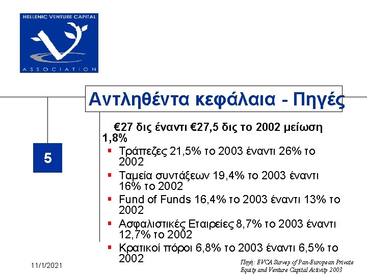 Venture capital στην ΕΕ το 20 • 4 11/1/2021 Επενδύθηκαν € 29, 1 δις σε 7, 446 εταιρείες § To 63, 3% των κεφαλαίων επενδύθηκε σε Buyouts • Το 21, 4% των κεφαλαίων σε Expansion Stage • Το 7, 9% των κεφαλαίων Replacement Capital Πηγή: EVCA Survey of Pan-European Private • Το 6, 8% των κεφαλαίων Start-up Equity and Venture Capital Activity 2003
