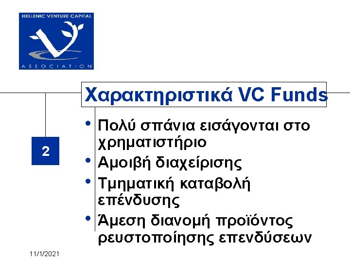 Αποδόσεις VC Funds στις ΗΠΑ 1969 -2001 7 Καθαρή απόδοση (IRR) στους επενδυτές στις 12/31/2003 με επενδυτικό ορίζοντα Fund Type 1 Yr 3 Yr 5 Yr 10 Yr 20 Yr Seed Stage VC -4, 7 -11, 6 -1, 7 17, 9 10, 6 Early Stage VC -7, 1 -23, 7 58, 3 38, 4 19, 9 11 -13, 9 19, 4 20, 4 13, 3 25, 4 -18, 8 3, 5 17 13, 8 All Venture 8, 1 -18, 9 22, 8 25, 5 15, 5 All Buyouts 24, 1 -2, 1 2, 2 7, 8 12, 4 Mezzanine 5, 7 1, 1 5, 6 7, 3 9, 6 18, 3 -7 6, 8 12, 7 13, 6 Balanced VC Later Stage VC All Priv Equity 11/1/2021 Thomson Venture Economics Venture. Xpert database