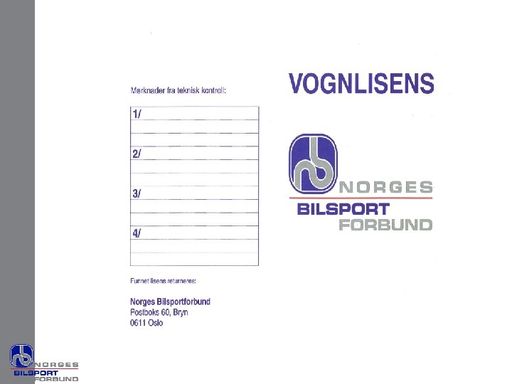 Vognlisens • • Bilens identitetspapirer Vises fram på teknisk kontroll Årskontroll må være gjort ved fornying Anmerkninger rettes før neste løp • Hvis ikke skal lisensen inndras og sendes NBF • Kan inndras ved store skader på bilen • I så tilfelle må bilen ha ny årskontroll • Ved tap/mistet lisens kreves ny årskontroll