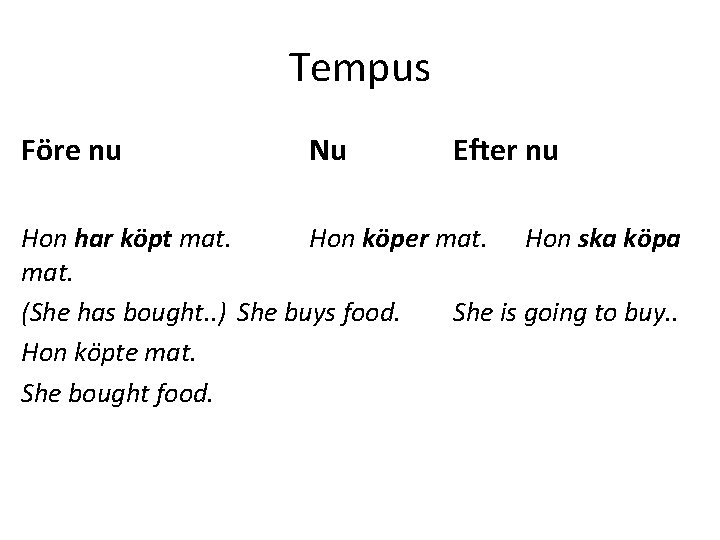 Tempus Före nu Nu Efter nu Hon har köpt mat. Hon köper mat. Hon ska köpa mat. (She has bought. . ) She buys food. She is going to buy. . Hon köpte mat. She bought food.