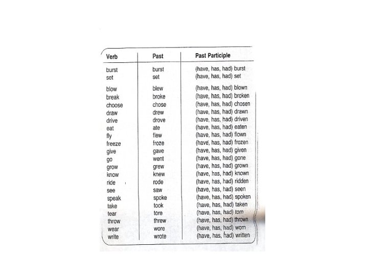 Irregular Verbs • The past and past participle forms do not follow the “ed” or “d” pattern. • Look at pages 495 & 496