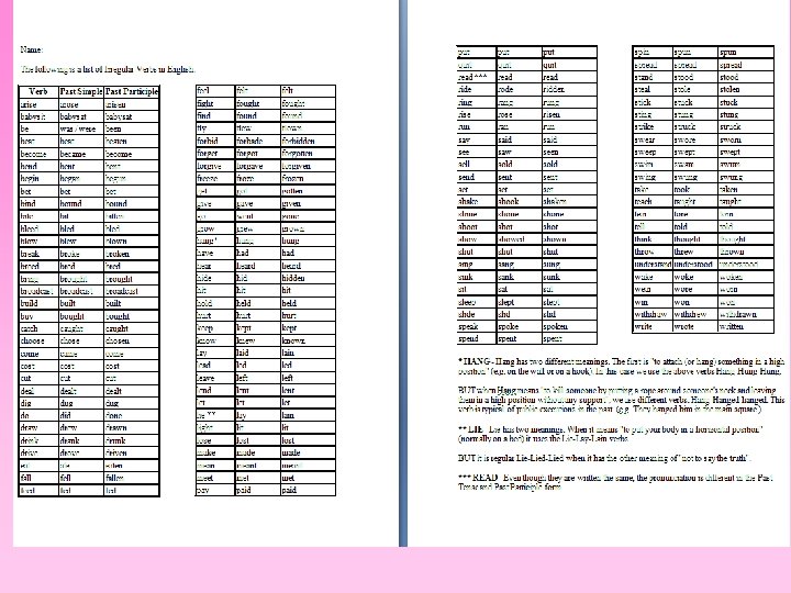 As an educated native speaker of English, you automatically use the correct verb form. However, far too many times, students say “have went” or “have rang. ” You should look over the list of irregularities (make it big enough to see) to be sure that you haven’t been using the wrong form of a verb without realizing it. (Linguist’s note: if everyone around you says “has went, ” you might choose to go with the flow, but you should know what the correct form is in case you find yourself surrounded by a group of people who “know better. ”)