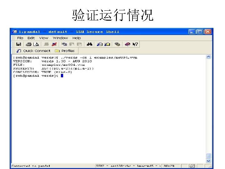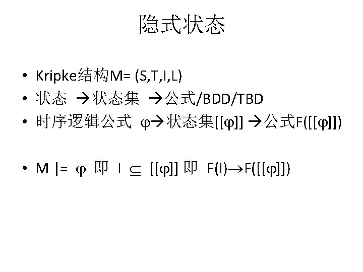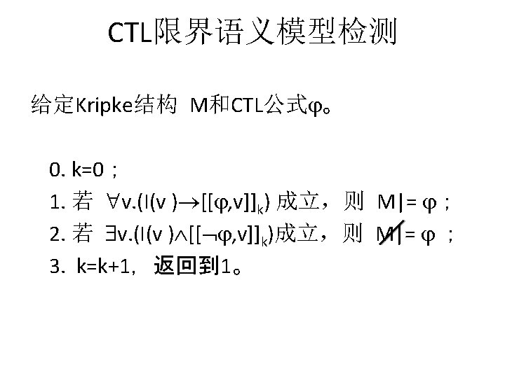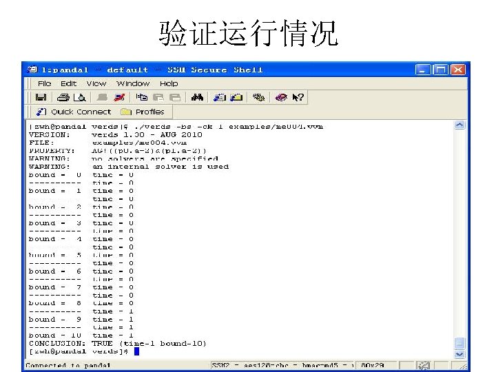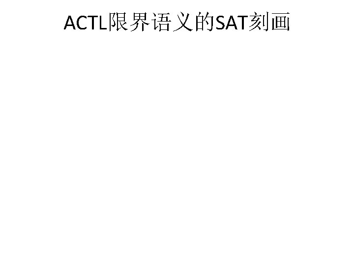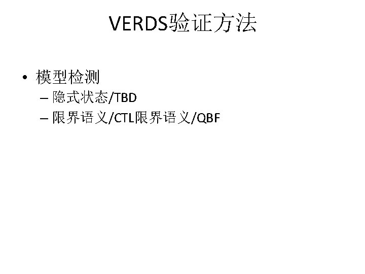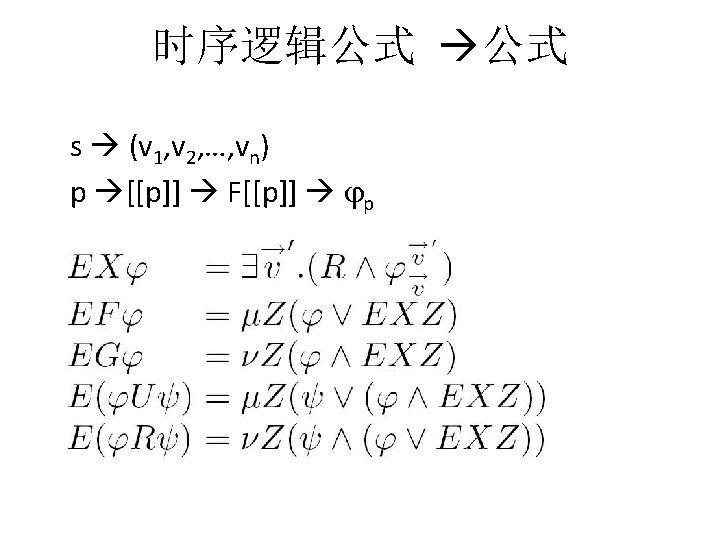 例子:互斥协议 迁移系统 VVM VAR INIT PROC me 005 x[0. . 1]: 0. . 1; t: 0. . 1; x[0]=0; x[1]=0; t=0; p 0: p 0 m(x[], t, 0); p 1: p 0 m(x[], t, 1); SPEC AG(!(p 0. a=s 2&p 1. a=s 2)); AG((!p 0. a=s 1|AF(p 0. a=s 2|p 1. a=s 2))& (!p 1. a=s 1|AF(p 0. a=s 2|p 1. a=s 2))); AG((!p 0. a=s 1|AF(p 0. a=s 2))&(!p 1. a=s 1|AF(p 1. a=s 2))); AG((!p 0. a=s 1|EF(p 0. a=s 2))&(!p 1. a=s 1|EF(p 1. a=s 2)));