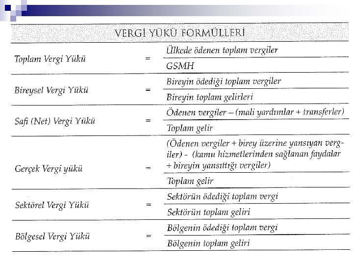 Vergi Yükünün Çeşitleri n n n Bireysel Vergi Yükü Toplam Vergi Yükü Net Vergi Yükü Gerçek Vergi Yükü Bölgesel Vergi Yükü Sektörel Vergi Yükü