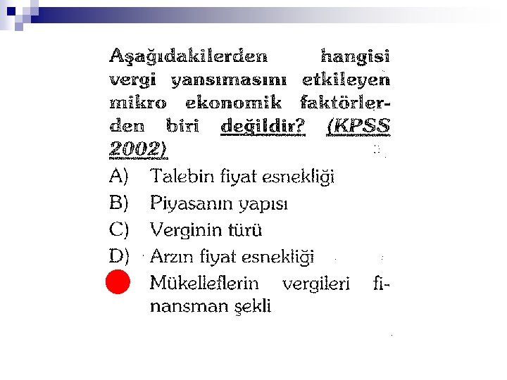 Arz Talep Esnekliği n n Talebi az esnek mallarda, malın fiyatı artsa dahi talep miktarı düşmez. Bu mallarda vergi daha kolay yansır. Örneğin, ekmek, tuz vb. Arz esnekliği fazla olan mallarda da üretici vergiyi malın fiyatına daha rahat ekleyebileceği için vergi daha kolay yansır.
