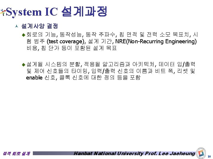 System IC 설계과정 Design Specifications Behavioral Modeling RTL level HDL Modeling Functional Simulation Front-end Design Logic Synthesis Gate-level Verification Placement & Routing Back-end Design Post-Layout Verification PG Out Mask Generation Fabrication Chip Test & Package 집적 회로 설계 Hanbat National University Prof. Lee Jaeheung 9