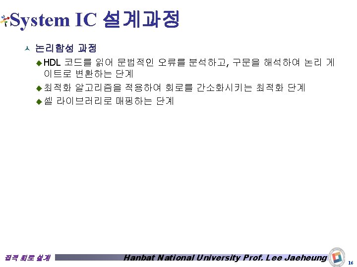 System IC 설계과정 © 논리합성 RTL Modeling Logic Synthesis Optimized Gate-level Netlist no Design constraints Target Library (Technology dependent) Meet Constraints ? yes Gate-level Netlist 집적 회로 설계 Hanbat National University Prof. Lee Jaeheung 15