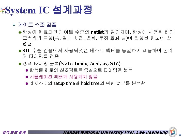 System IC 설계과정 © 논리합성 과정 Synthesis = Translation + Logic Optimization + Mapping residue = 16’h 0000; if (high_bits == 2’b 10) residue = state_table[index]; Translate (read) else state_table[index] = 16’h 0000; Optimize + Map (compile) HDL Source Generic Boolean Target Technology 집적 회로 설계 Hanbat National University Prof. Lee Jaeheung 17