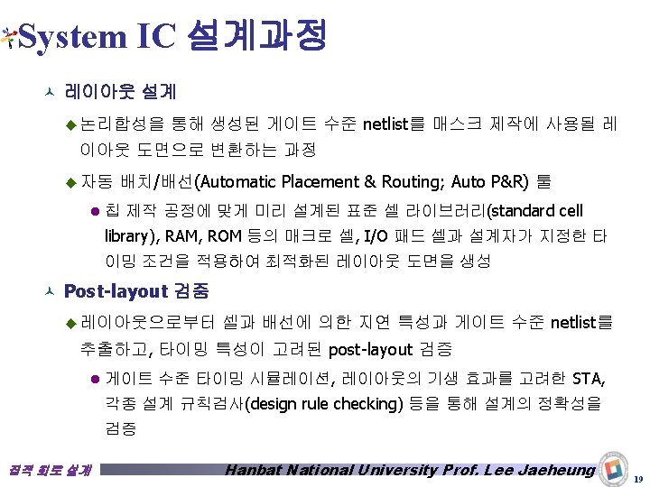 System IC 설계과정 © 레이아웃 설계 Auto P&R 집적 회로 설계 Hanbat National University Prof. Lee Jaeheung 20