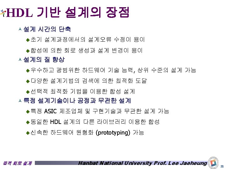 Verilog HDL 개요 한밭대학교 반도체설계실 Sun, Hye-Seung Hanbat National University Prof. Lee Jaeheung