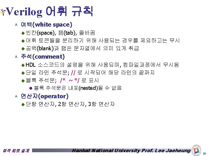 Verilog 어휘 규칙 © 어휘 토큰 (lexical tokens) ◆ 여백(white space) ◆ 주석(comment) ◆ 연산자(operator) ◆ 수(number) ◆ 문자열(string) ◆ 식별자(identifier) ◆ 키워드(keyword) 집적 회로 설계 Hanbat National University Prof. Lee Jaeheung 24
