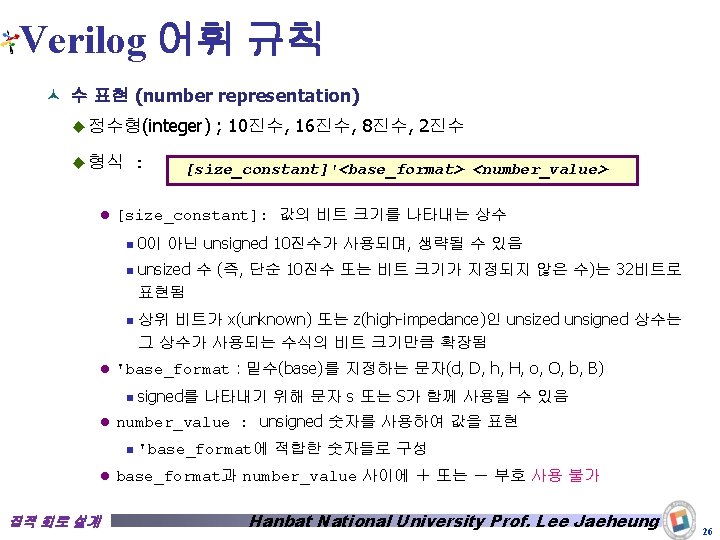 Verilog 어휘 규칙 ; IEEE Std. 754 -1985(IEEE standard for double-precision floating-point number) ◆ 실수형(real) 1. 2 2394. 26331 1. 2 E 12 1. 30 e-2 0. 1 e-0 29 E-2 236. 123_763_e-12 (underscores are ignored) 문법적 오류. 12 9. 4. E 3. 2 e-7 집적 회로 설계 Hanbat National University Prof. Lee Jaeheung 32