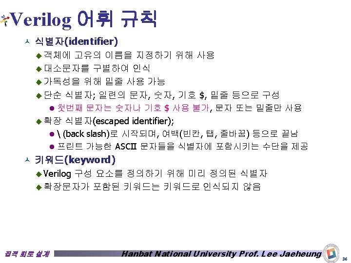 Verilog 어휘 규칙 module string_test; reg [8*14: 1] stringvar; initial begin stringvar = "Hello world"; $display("%s is stored as %h", stringvar); stringvar = {stringvar, "!!!"}; $display("%s is stored as %h", stringvar); endmodule Hello world is stored as 00000048656 c 6 c 6 f 20776 f 726 c 64 Hello world!!! is stored as 48656 c 6 c 6 f 20776 f 726 c 64212121 집적 회로 설계 Hanbat National University Prof. Lee Jaeheung 35