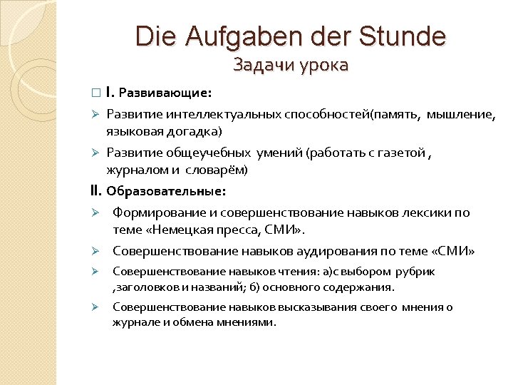 Verlauf des Unterrichts I. Anfang der Stunde �Die Aufgaben der Stunde und die Hausaufgabe für die nächste Stunde: Sucht im Internet die Information über die deutsche Presse für die Jugendlichen. II. Phonetik �Wir wiederholen die Wörter und Wortbildungen zum Thema „Die Massenmedien. “ Seite 182, 167.