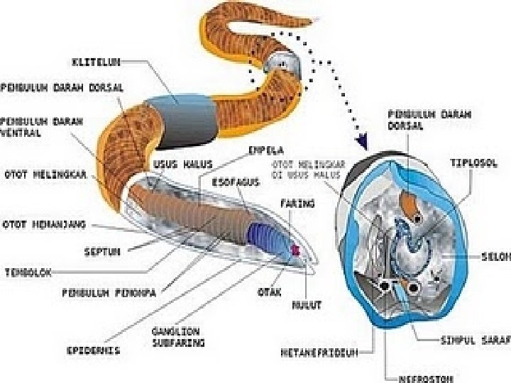 Pheretima aspergillum • segmennya mencapai 95 -150 segmen. • Klitelumnya terletak pada segmen 14 -16 • Tubuhnya berbentuk gilik panjang dan silindris berwarna merah keunguan