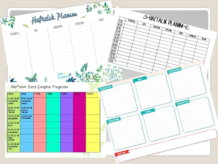 �En kullanışlı planlardan biri “HAFTALIK PLAN” dır. �Bu plana o hafta içerisinde yapmayı hedeflediğiniz aktiviteleri yazarsınız. Bu, ders çalışmakla sınırlı değildir. �Planlar yapılırken esnek davranılmalı ve doldurmak için gereğinden fazla şeyler yazılmamalıdır.