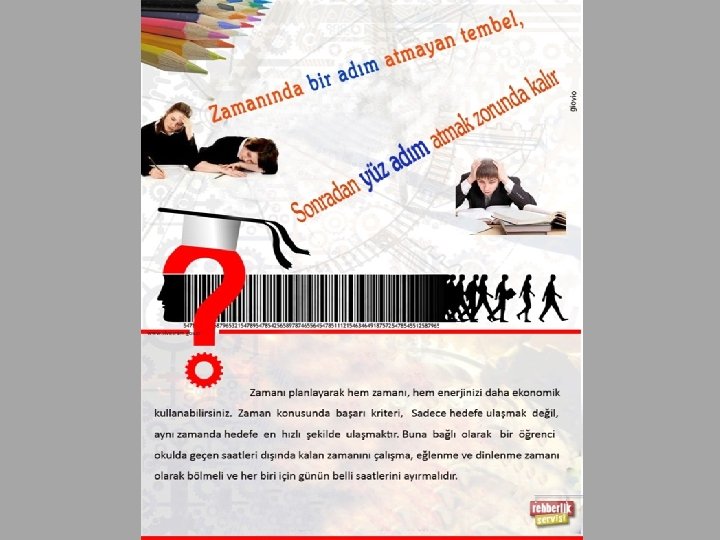 planı hazırlarken � Çalışma sırasında her derse belirli bir süre ayrılmalıdır. hangi dersin hangi saatte Bu süre, dersin kolay ya da çalışılacağı kararlaştırılmalıdır. Çünkü zor oluşuna, çalışılacak zor ve ağır dersler zihnin konunun kısa ya da uzun uyanık ve canlı olmadığı oluşuna, öğrencinin konu ile zamanlara yerleştirilirse ilgili ön bilgisine göre öğrenme zorlaşır. değişebilir. � Çalışma
