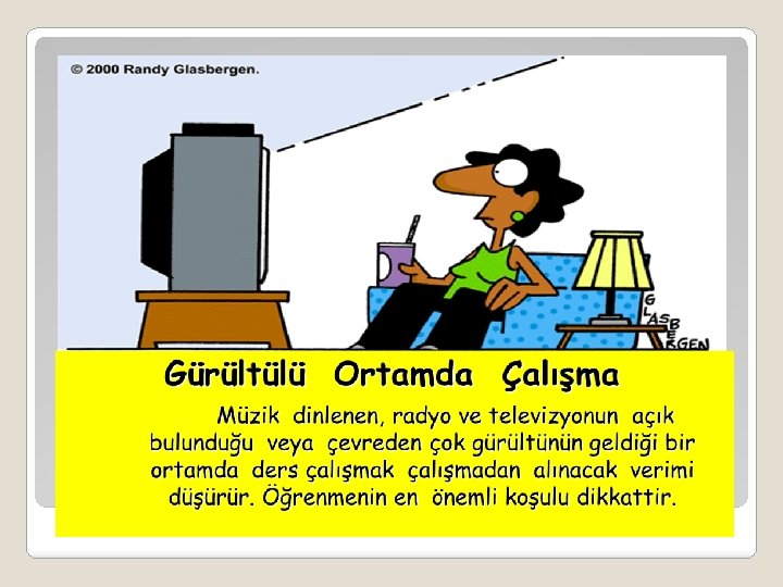 � Yatarak ders çalışılmaz. Beyniniz � Çalışmaya verdiğiniz aralarda dizi yatma durumunu uyumak, yorgun izlemek, filme başlamak gibi olmak, dinlenmek, hasta olmak, aktivitelere yer vermeyin. Ara televizyon izlemek gibi aktivitelerle verdiğiniz süre içerisinde ilişkilendirir. Bu yüzden yatma bitmeyecek bir etkinlik, aklınızın pozisyonu aldığınız zaman ders orada kalmasına veya verdiğiniz çalışmaya odaklanamazsınız. arayı uzatmaya neden olur.