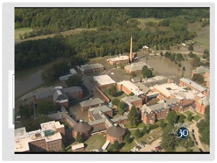 VERMONT STATE COLLEGES-WHAT HAPPENED • By 6 am on 8/29 – water had filled basement and up to 5 feet of the first floor • Generator under water = power gone • Entire state office complex flooded • Roads to town closed