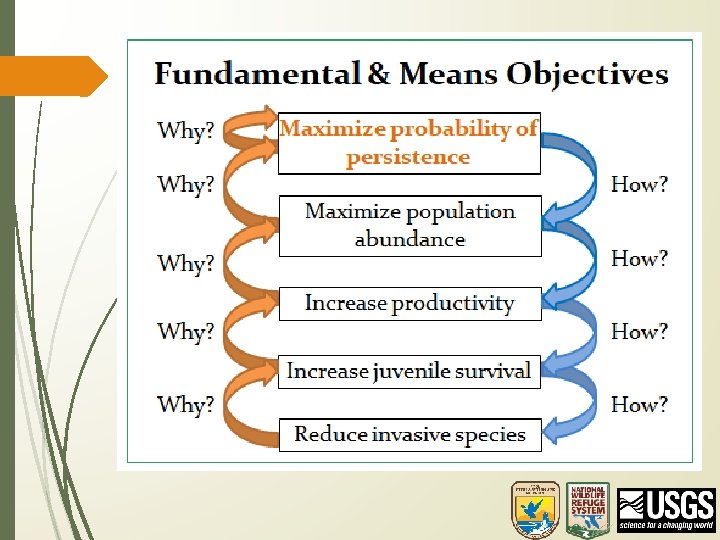 Objective Hierarchy (all go into HMP) Fundamental objectives What you ultimately value, regardless of whether or not you can measure it. Why do you want that? Just because…. How do I achieve this? Means objectives Why is this important? Describes ‘how’ you can achieve the fundamental objective. Can be measured (e. g. population, habitat, abiotic) Attributes One or more characteristic of the system you plan to measure to meet your objective. e. g. species abundance, body How do I condition, native species diversity index, etc. know?