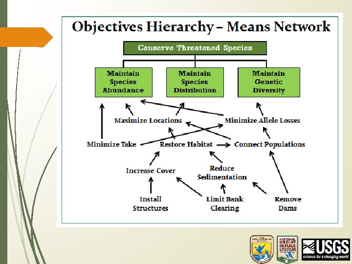 Refuge Breakout Goals Create an objective hierarchy: • Fundamental • Means Identify potential attributes for each objective: • content (measurement - be specific!) • direction (increase, decrease) • aspiration (max, min, threshold) Translate into HMP objective • as needed, but after workshop