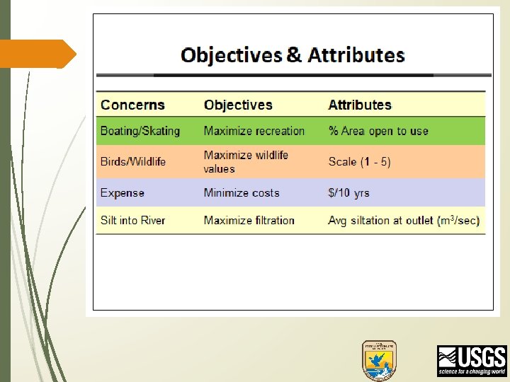 Each objective is described by 1 or more attributes. Attribute: • Content (what you’ll measure) • Preferred direction of the measured content • The aspiration • • • maximize (or minimize) an absolute threshold level a particular level of change (rate of change) Example: Means obj - establish a reproducing plant pop • 3 -year mean flowering stem density (stems/m 2) • Increase (more is better) • Maximize (or Threshold > 100 stems/m 2)