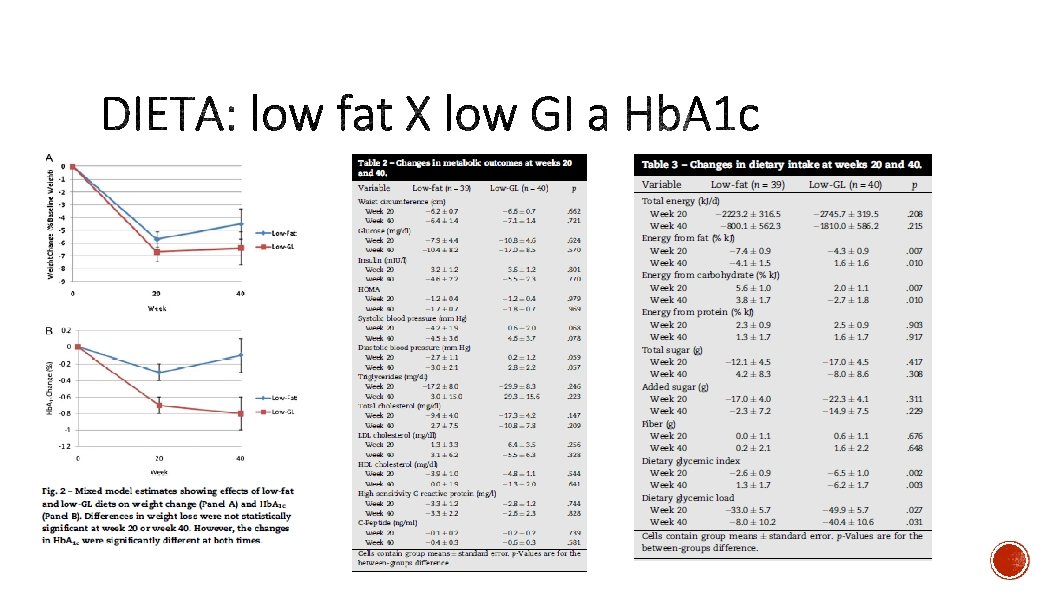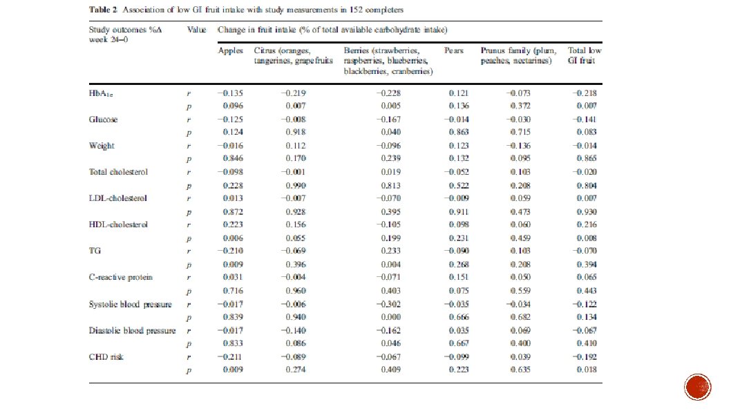 § Základní otázka: Je rozdíl v konzumaci ovoce s vyším a nižším GI pro riziko KVO u osob s DM II. ? § Závěr: konzumace ovoce s nižším GI snižuje koncentraci Hb. A 1 c, hodnotu systolickeho krevního tlaku a riziko KVO (zvýšení HDL cholesterolu) § Možné příčiny a souvislosti: otázka různě upraveného ovoce (celý kus, pyré, šťáva) obsah jiných složek ovoce, které přispívají k prevenci KVO