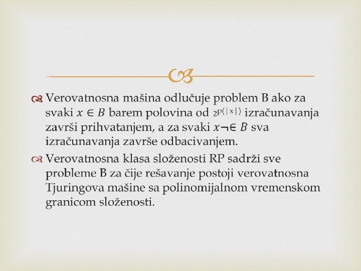 Definicija: Verovatnosna Tjuringova mašina je nedeterministička Tjuringova mašina sa sledećim osobinama: za svaki ulazni podatak sva izračunavanja se završavaju u jednakom broju koraka koji je ograničen polinomijalnom funkcijom p(|x|) i u svakom koraku izračunavanja koji nije poslednji postoji tačno dva moguća nastavka.