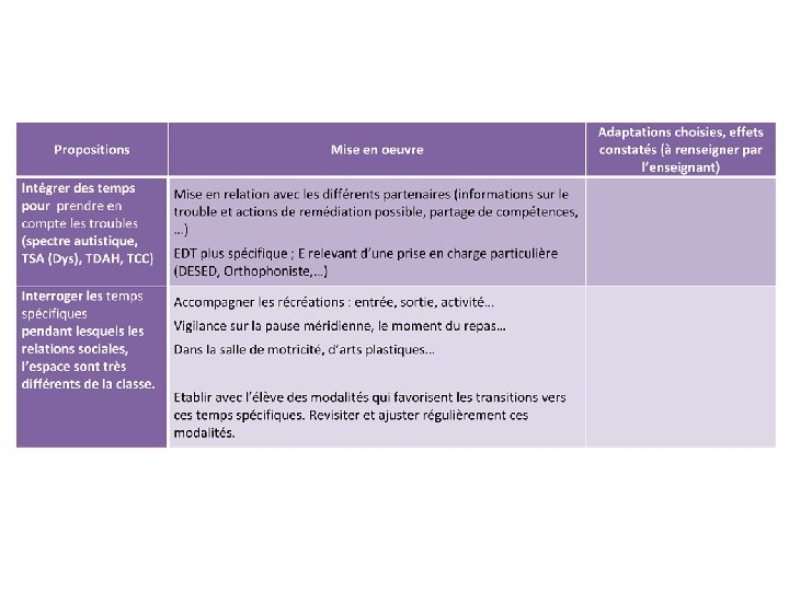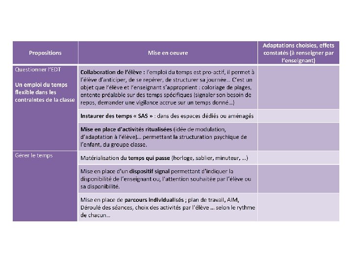 Proposition 2 : Actions Enseignements scolaires Connaissances Elève Programmes de la N-C Actions Enseignant de la classe Enseignements - Différenciation en lien avec le PPESA - Explications des activités enseignants/ AVS - Explications des objectifs à atteindre Actions et gestes AVS Reformuler la consigne Compenser des actions qui ne peuvent être réalisées par l’élève (découpage, dictée à l’adulte…) Se déplacer en milieu scolaire Connaître les différents lieux de l’école et leurs utilités (classes, toilettes, cantine…) Se socialiser / Participer aux projets de la classe et de l’école Se socialiser avec ses pairs Favoriser des enseignements et des Prendre conscience de sa différence actions pour la construction du vivre Avoir confiance en soi ensemble et de la prise de conscience des différences Accompagner l’élève dans ses gestes de la vie quotidienne Aider l’élève à se déplacer dans l’école Favoriser l’interaction de l’enfant en situation de handicap avec ses pairs Développer le tutorat et le travail en petits groupes dans les classe pour favoriser l’autonomie des élèves Adapter l’aménagement de l’espace et du temps pour favoriser l’autonomie des élèves Travailler avec un tuteur dans la classe Accepter de travailler en groupe Devenir autonome Utiliser seul les outils mis en place Mettre en place des situations favorisant le tutorat et le travail de groupe Se repérer dans l’espace de la classe Permettre l’autonomie des élèves en Utiliser un timer expliquant l’utilisation des outils Utiliser son emploi du temps individualisé Permettre aux élèves d’avoir une Permettre aux élèves de libérer les activité secondaire ou un coin tensions apaisant (pour désamorcer une crise) Document de suivi de l’élève Mise en place d’outils permettant à l’élève de gagner en autonomie et de se passer de l’AVS Mettre en place un emploi du temps au plus proche des rythmes biologiques de l’élève Mise en place d’un projet d’accompagnement pour les élèves TDAH, problèmes attentionnels et comportementaux Permettre à l’enfant de devenir autonome en le laissant au fur et à mesure interagir de plus en plus seul avec ses pairs Vérifier la compréhension de l’emploi du temps, du timer