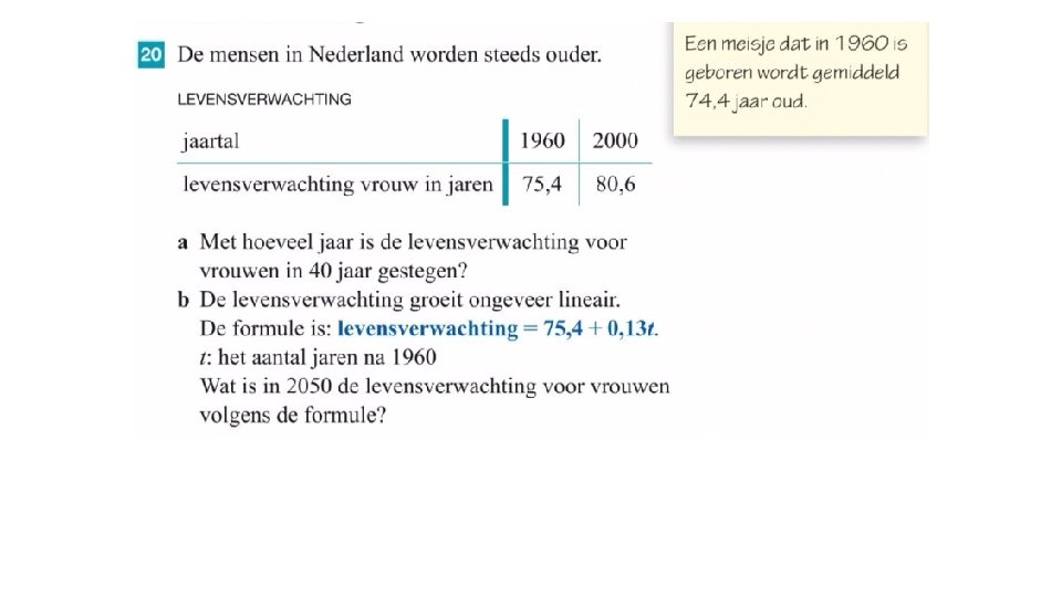 a) 80, 6 – 75, 4 = 5, 2 jaar a) 2050 – 1960 = 90 75, 4 + 0, 13 x 90 = 87, 1 jaar