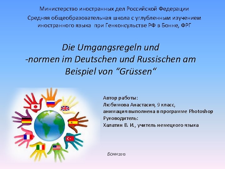 Schlussfolgerung Unsere Projektarbeit eignet sich für alle, die sich für die Deutsche Sprache interessieren und ihre Kenntnisse über die interkulturelle Kommunikation erweitern möchten, weil das Verständnis der Umgangsregeln und –normen im Deutschen und Russischen notwendig ist.