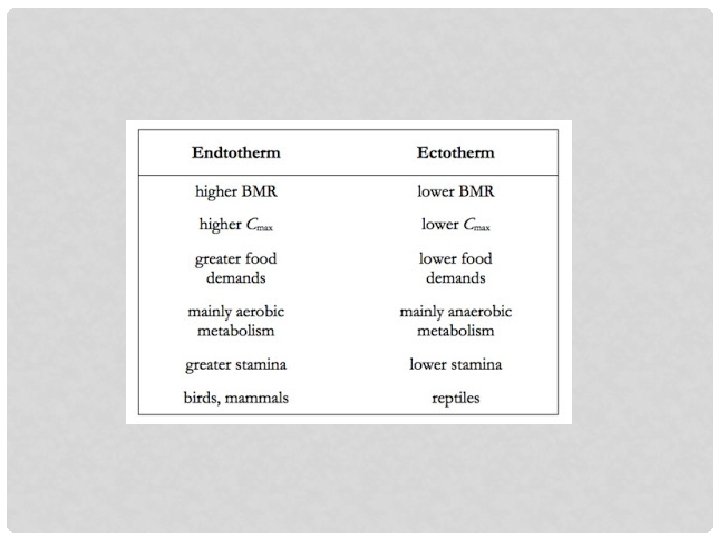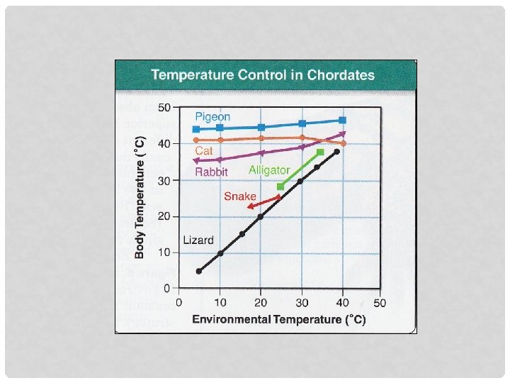 d. Internal Temperature Control • Fish, amphibians and reptiles are ectothermic. The have an internal body temperature that varies with external (environmental conditions) due to a slow metabolism. • Birds and mammals are endothermic. They maintain a relatively high and constant internal body temperature that is regulated internally due to a fast metabolism. • This adaptation is very important for animals living in habitats where temperatures and seasons are variable. Iguana Polar Bear Penguin