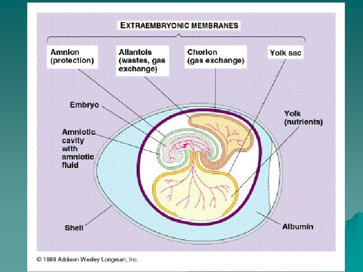 Evolution of the Amniotic Egg u Amnion - Protects from dehydration and mechanical shock u Yolk Sac - Nutrient storage u Albumin - Nutrient storage u Allantois - stores waste, gas exchange u Chorion - gas exchange
