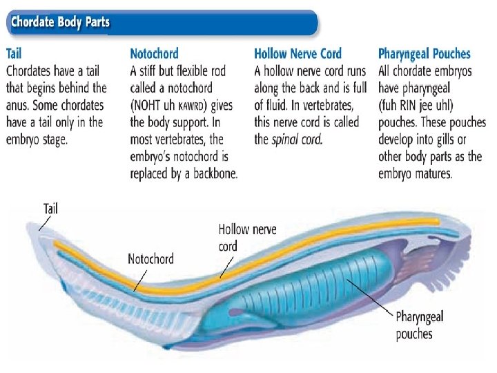 Vertebrate - Animals with a backbone - Belong to phylum chordata - Vertebrates have developed head and skull Four Body Parts of Chordates 1. Tail 2. Notochord (sometimes replaced by backbone) 3. Hollow nerve cord (spinal cord 4. Pharyngeal Pouches (gills)