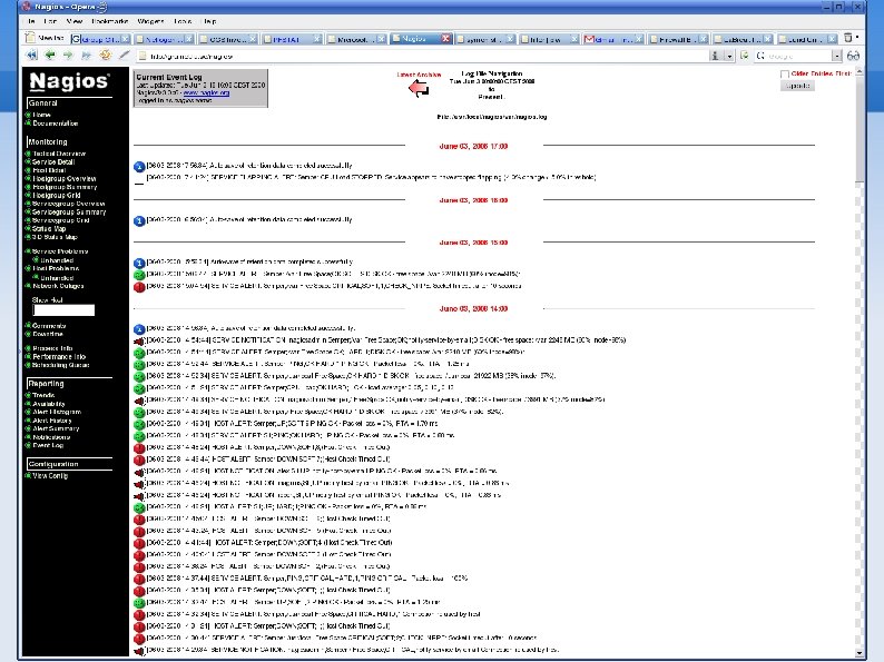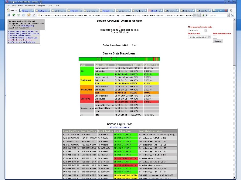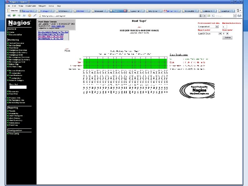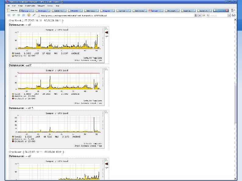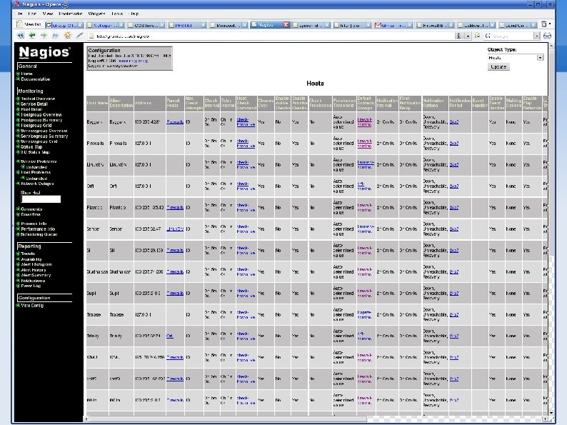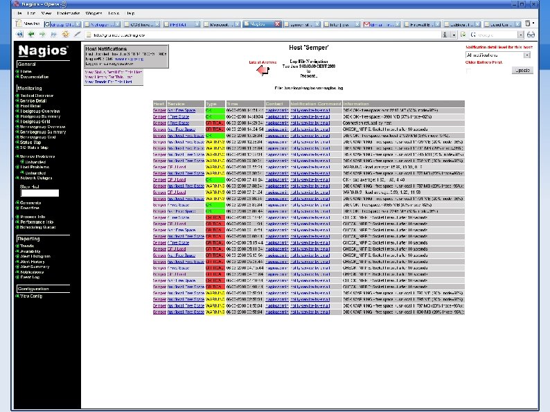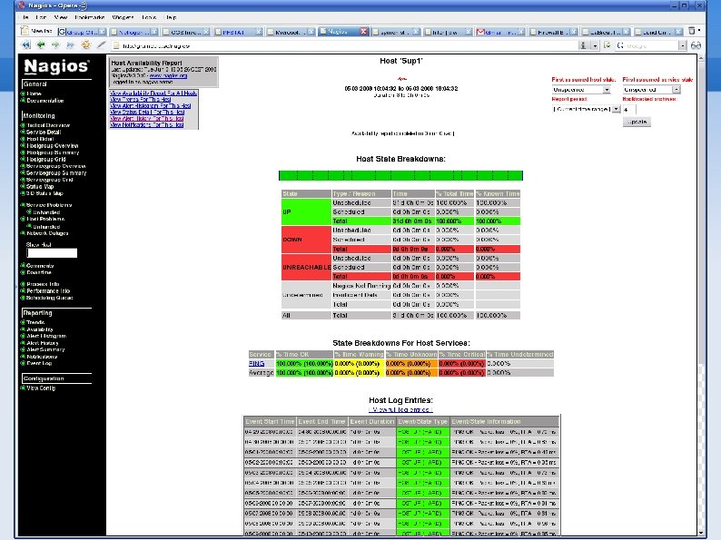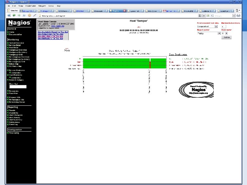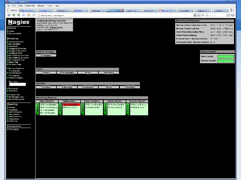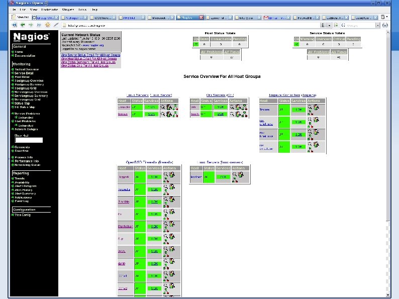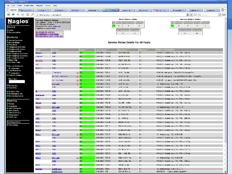 Övervakning Nagios Med eller utan agenter Varnar via email eller SMS Huvudsakligen kontroll av tjänster och upptid Ganska enkel installation Lite knepig konfigurering Har funnits länge och säljs även kommersiellt